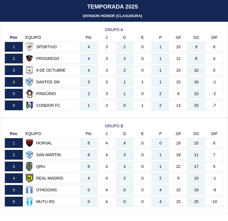TABLA DE POSICIONES EN DIVISIÓN HONOR